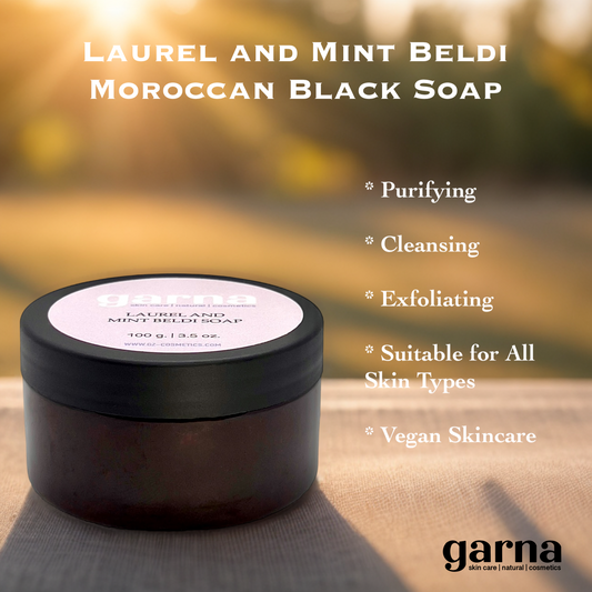 Garna Laurel & Mint Beldi Moroccan Black Soap 3.5 oz, Exfoliating Body Peeling with Bay Leaves and Olives - Traditional Hammam Spa Skin Care for Cleansing and Refreshing